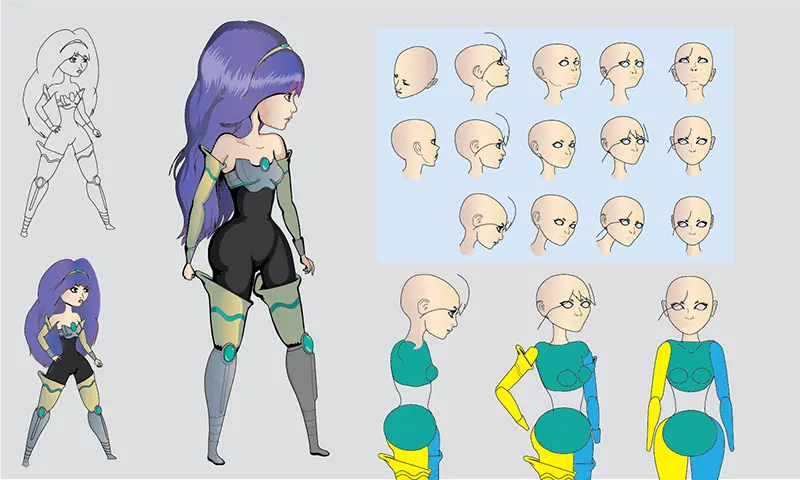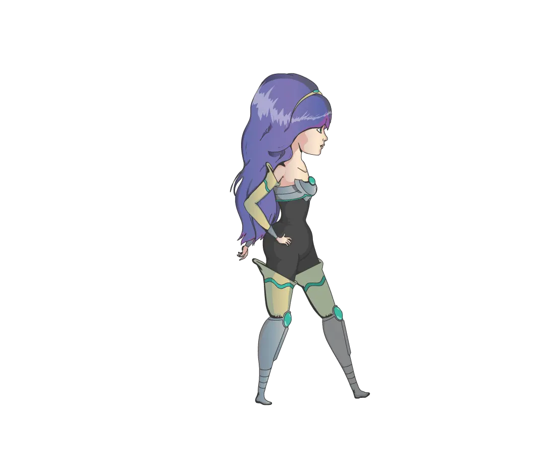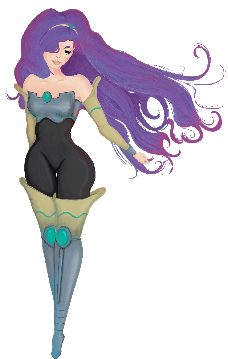 To emphasize that the protagonist is an acrobatic powerhouse, I made her mostly bottom heavy with very tiny hands and legs. I did have to modify the design a bit to be more rectangular in pose. This was to help better identify her hurtboxes. Thematically I took designs elements from ballerinas, knights, and added what I felt were cosmic motifs to create her design.